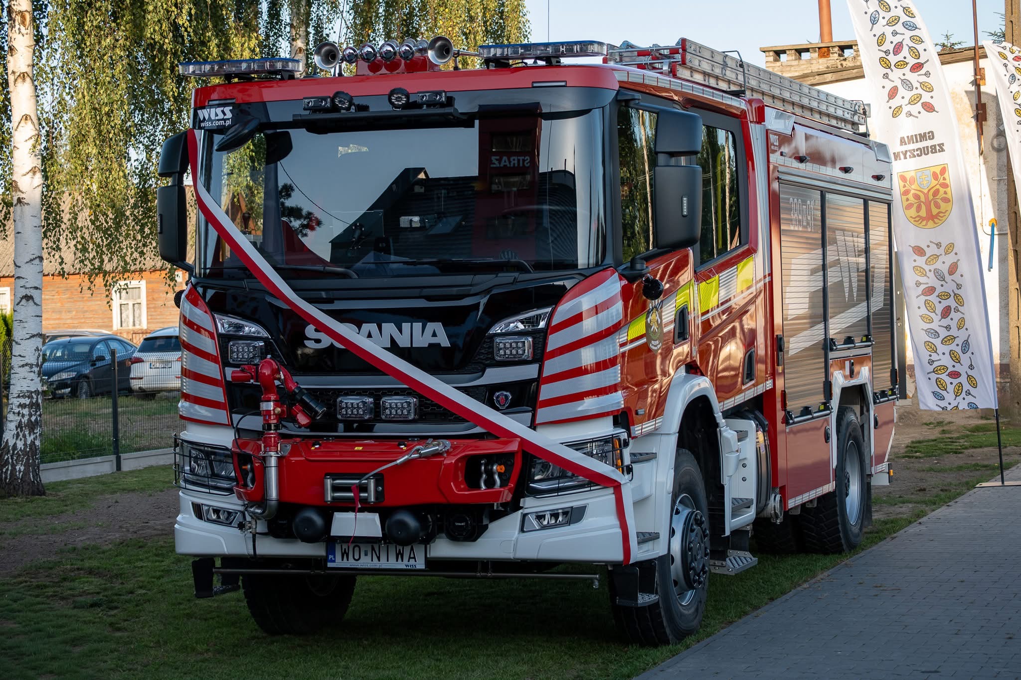 Jednym z najważniejszych momentów uroczystości było uroczyste przekazanie nowego średniego wozu strażackiego Scania. Pojazd został zakupiony m.in. dzięki wsparciu naszego WFOŚiGW, na które złożyła się dotacja w wysokości 100 000 złotych oraz częściowo umarzalna pożyczka w wysokości 351 994 zł.